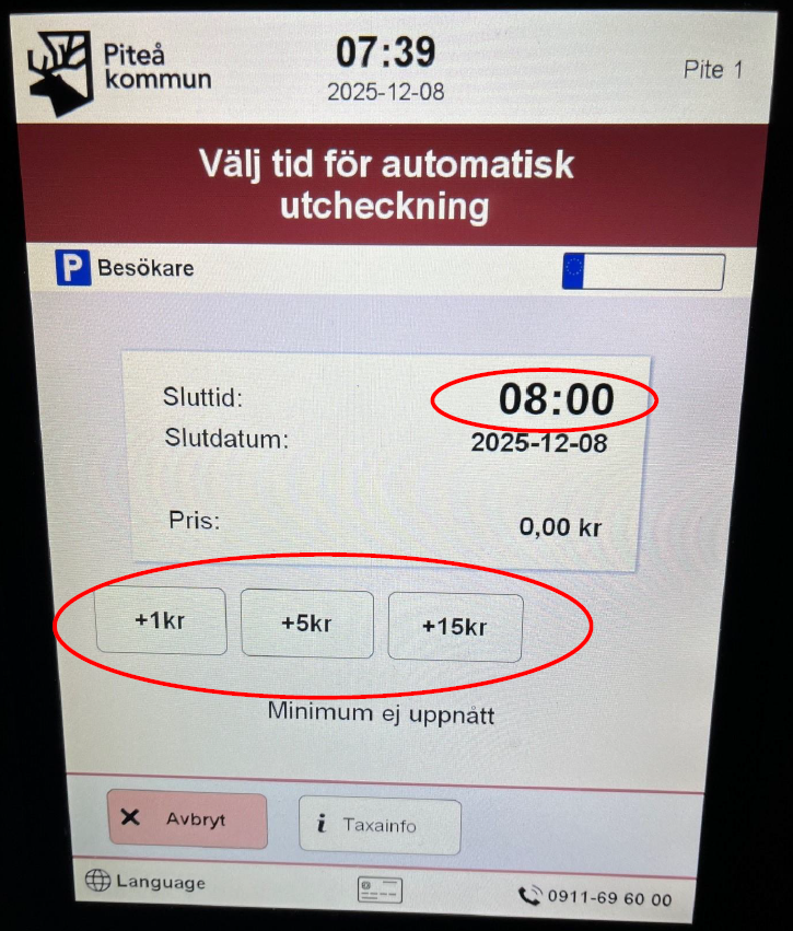 Använd betalknapparna på skärmen, kostnad 15 kr/timme. Sluttiden visas på skärmen.