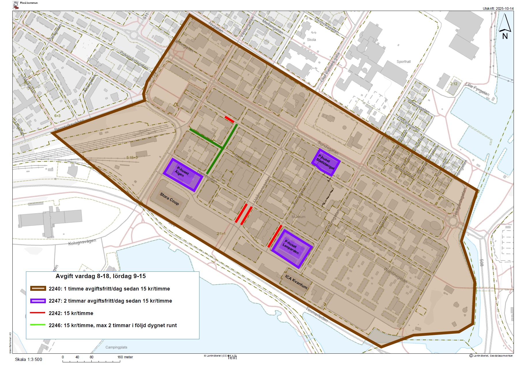 - Parkeringar som omfattas av den bruna zonen (zonkod 2240): Avgiftsfri tid kortas ned från två timmar till en timme. Därefter 15 kr/timme.
