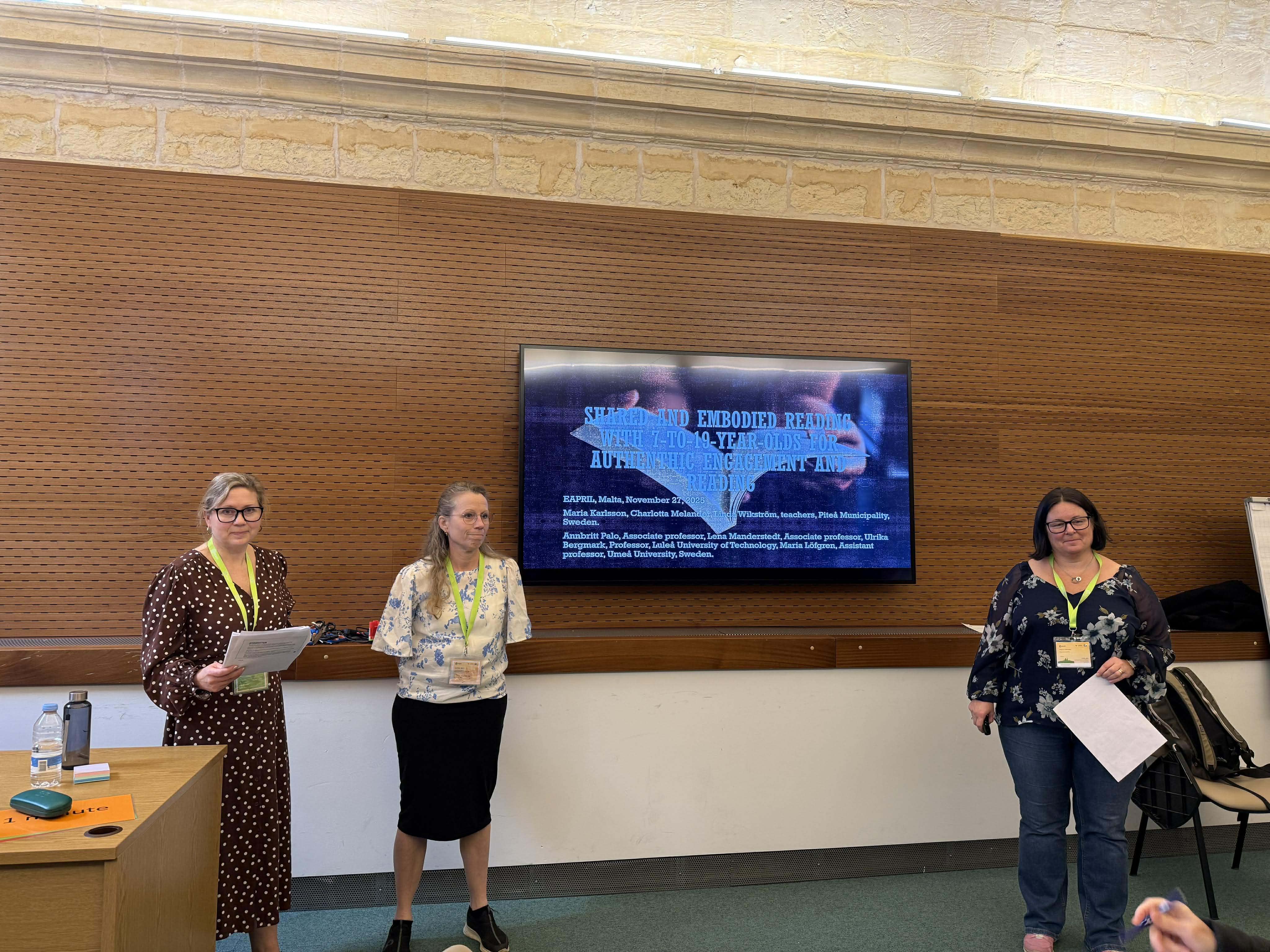 November avslutades med konferensen EAPRIL (European Association for Practitioner Research on Improving Learning), som denna gång hölls i Valletta, Malta. Temat för konferensen var Keeping it real: embracing authenticity in education in the age of AI and innovation. Förutom att delta i skolbesök presenterade deltagarna från Piteå och Luleå tekniska universitet resultatet av forskning och utvecklingsarbete. Maria Karlsson, Charlotta Melander och Linda Wikström genomförde en workshop om förkroppsligat lärande med utgångspunkt i erfarenheter från projektet Läskraft. Här fick deltagarna bland annat ställa frågor till mannen med det röda äpplet från Jan Lööfs klassiska barnbok samt tillverka pappersfigurer föreställande Ebenezer Scrooge från Charles Dickens En julsaga. Ulrika Bergmark presenterade sin studie om Läskraft, Christina Wiklund och Caroline Graeske (från Luleå tekniska universitet) berättade om de båda studier om AI i undervisningen ur lärar- och elevperspektiv som genomförts i Piteå kommun, och Sara Viklund talade om sitt avhandlingsarbete. Maltaresan finansierades med hjälp av SFUB, Skolforskningsinstitutet och Kempestiftelsen.