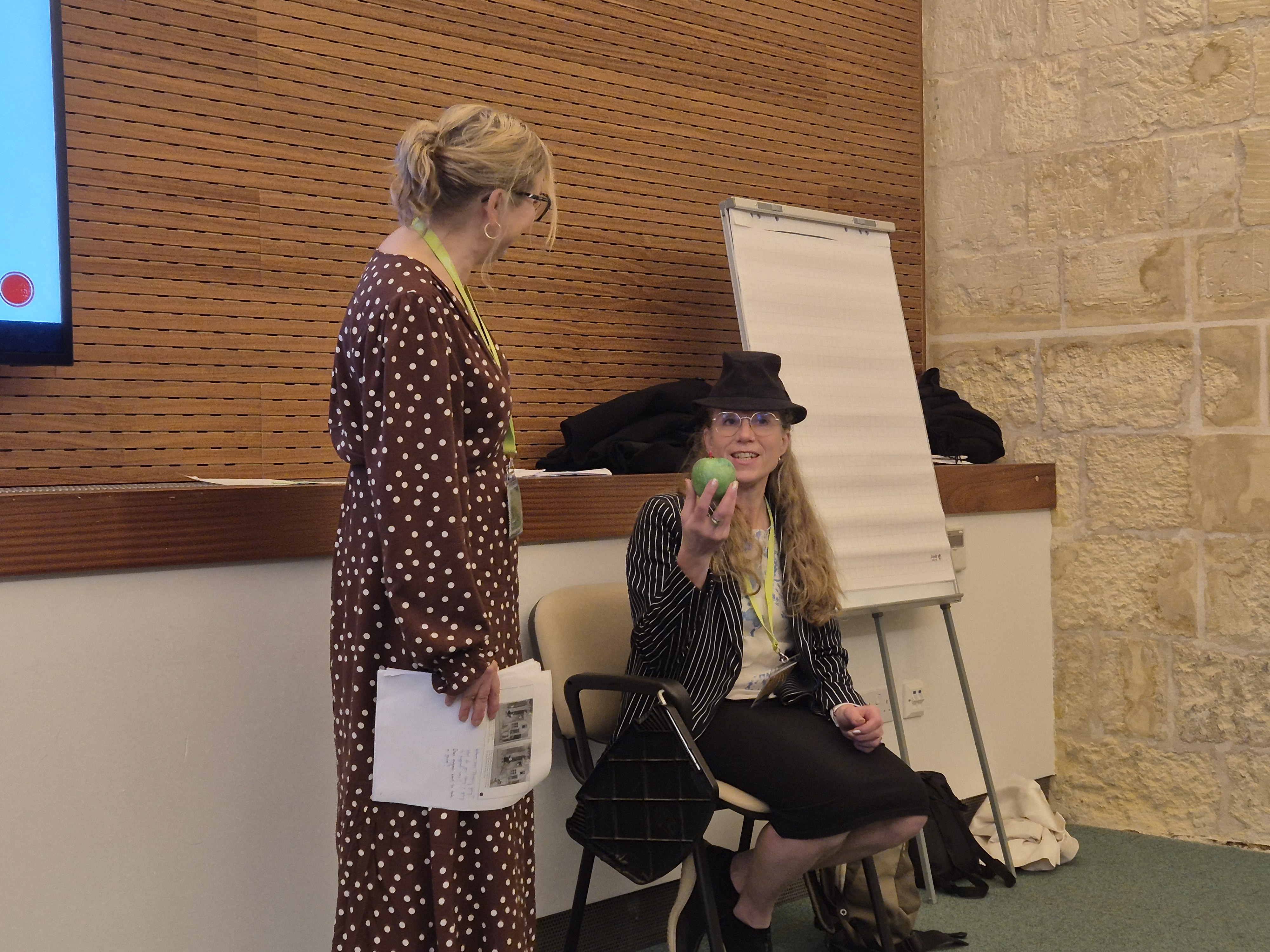 Linda Wikström samtalar med Maria Karlsson (i rollen som mannen i Sagan om det röda äpplet)