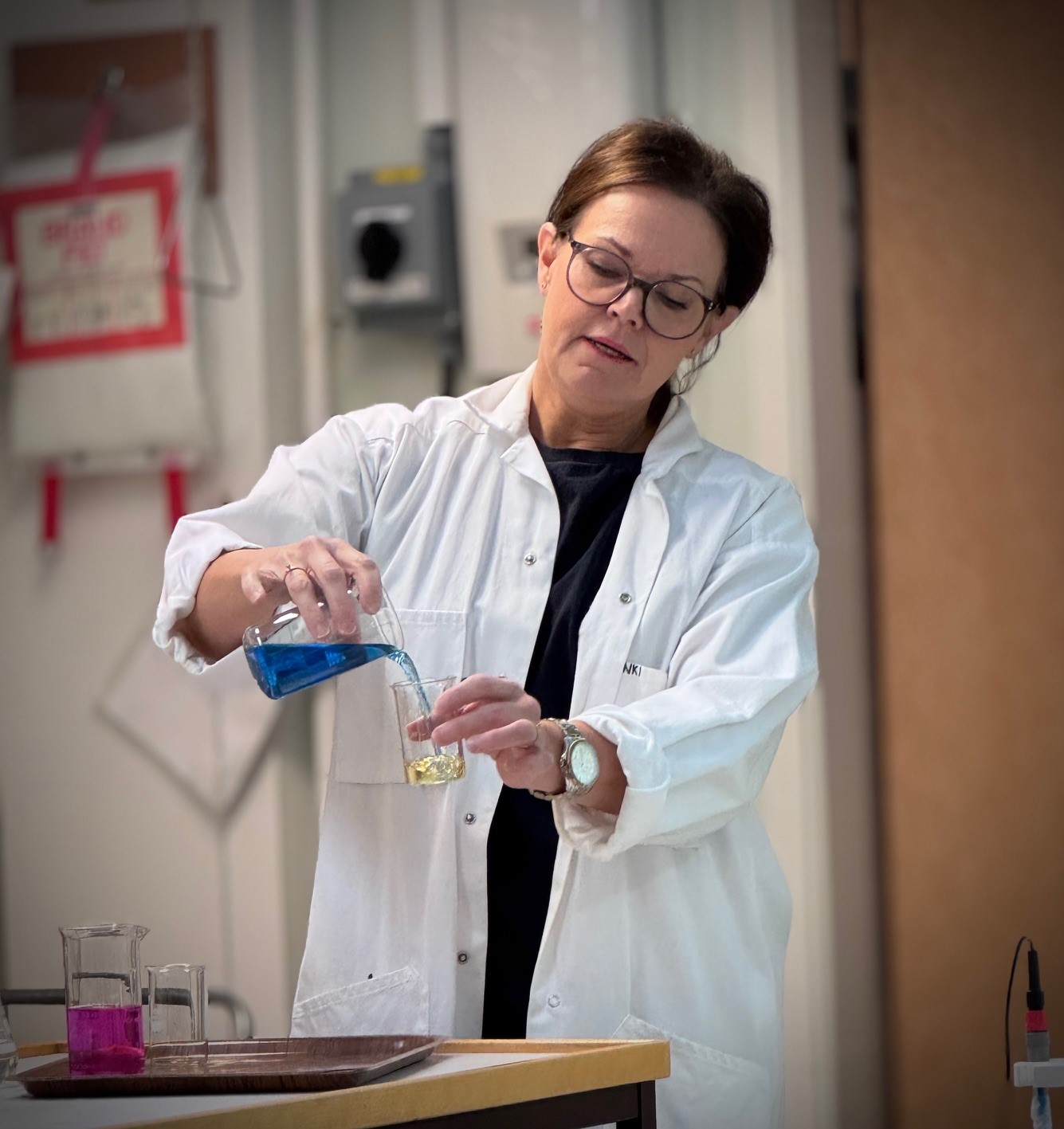 Ann-Kristine Norman arbetar som matematiklärare på Strömbackaskolan, här visar hon hur en vätska ändrar färg utifrån pH-värde.