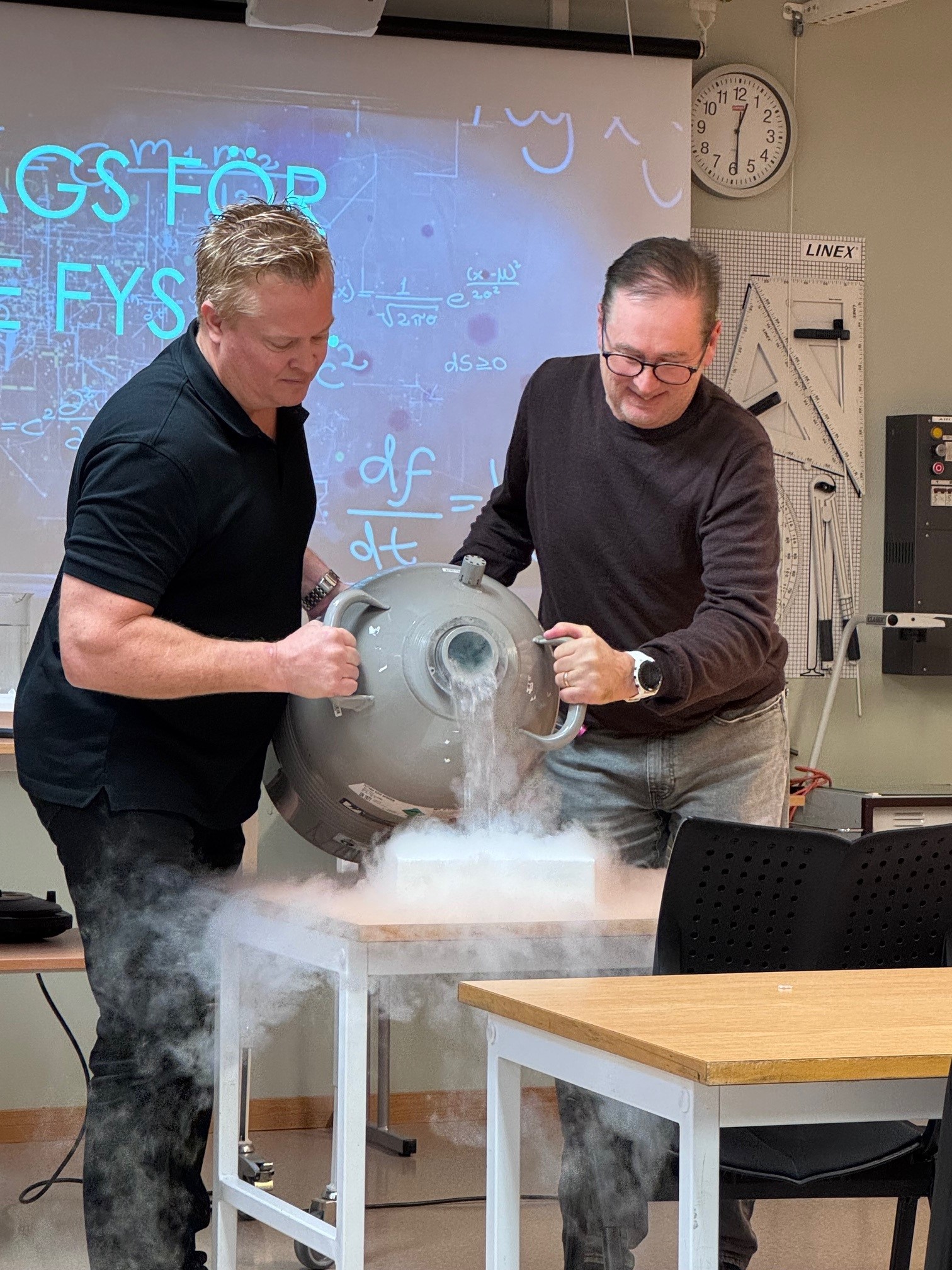 Fysiklärarna Robert Norman och Jörgen Nordsvahn hjälps åt att hälla upp flytande kväve som en del i ett experiment.