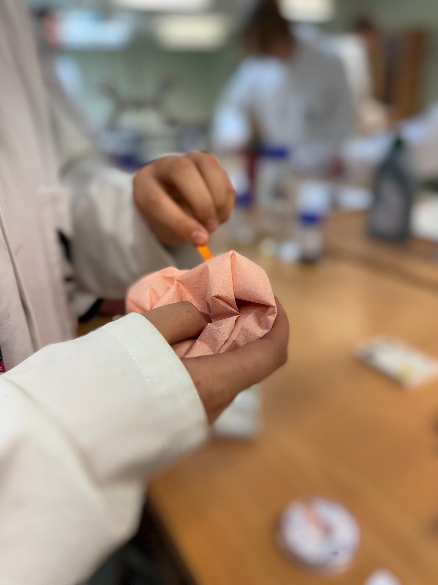 Under dagen fick eleverna delta i fyra olika pass. I kemisalen undersöktes vardagskemikalier, vad är surt och vad är basiskt? Färger skiftade och pH-värden mättes under handledning av gymnasiets Naturelever.